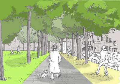 Die ursprüngliche Formensprache der Parkanlage wird durch geplante Neupflanzungen wieder aufgegriffen und Lücken in der vorhandenen Pflanzung werden geschlossen. Neue Wegeverbindungen erschließen